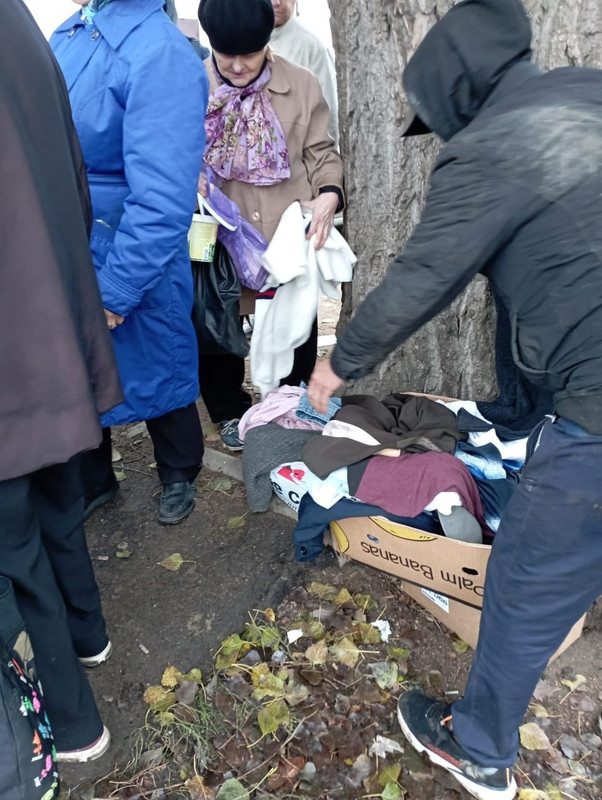 В этот раз помимо обеда, привезли и раздали одежду. Люди искренне благодарят добровольцев за помощь.